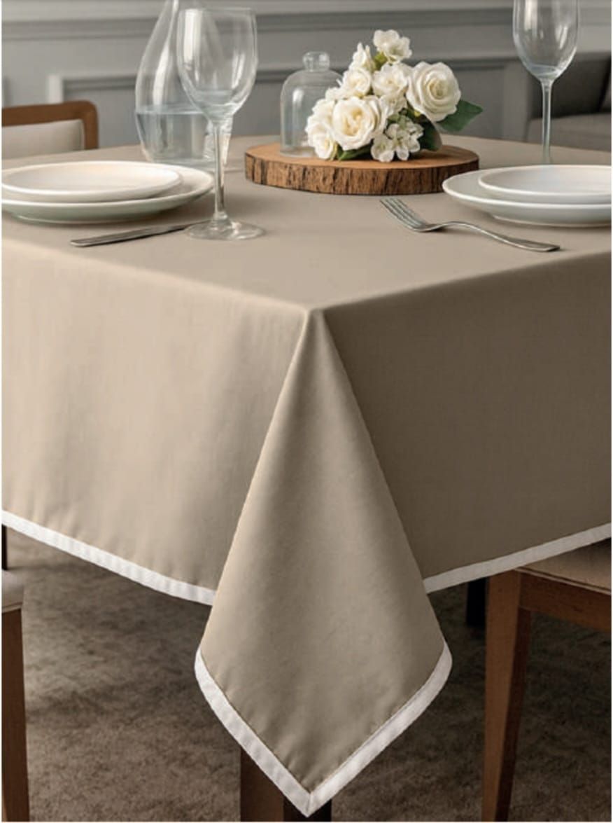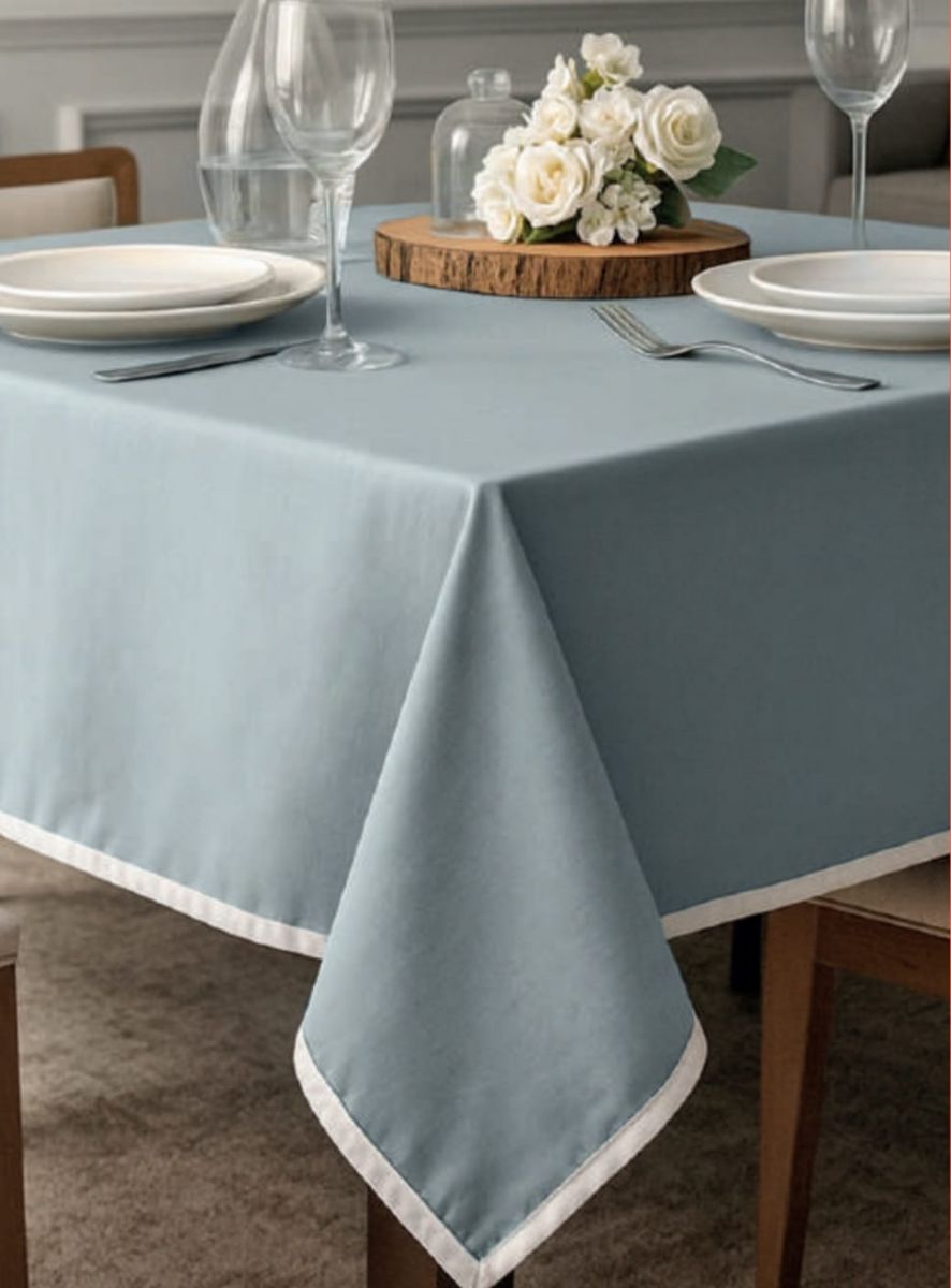 Tovaglia in puro cotone panama tinta unita con bordo bianco a contrasto.