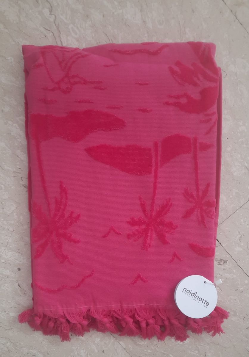 Telo mare in spugna velour rasato con fantasia tropicale e nappine sul fondo.